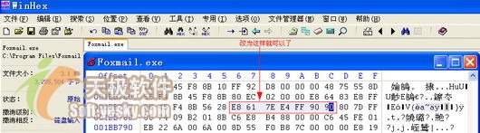 我們可以想辦法DIY一個(gè)新Foxmail,它對(duì)任何口令都具有“免疫力”——無(wú)論你輸入任何密碼都可以進(jìn)入自己的賬戶(hù)中。請(qǐng)大家下載工具軟件WinHex,運(yùn)行該軟件用它打開(kāi)Foxamil安裝目錄下的foxmail.exe文件,同時(shí)按下Ctrl+Alt+F打開(kāi)“查找16進(jìn)制數(shù)值”對(duì)話框(圖1),在這里輸入E8617EE4FF7515,單擊“確定”開(kāi)始查找,找到后把其中的7515改為9090,其他代碼不用改(圖2),然后保存就可以了。該技巧對(duì)最新的Foxmail5.0.500.0版有效。對(duì)于早些的Foxmail5.0.290.0可以查找E82978E4FF7515,找到后同樣把改為7515改為9090,其他代碼不用改,保存后就可以無(wú)需口令進(jìn)入加有口令的賬戶(hù)。(點(diǎn)這里下載WinHex漢化版)
