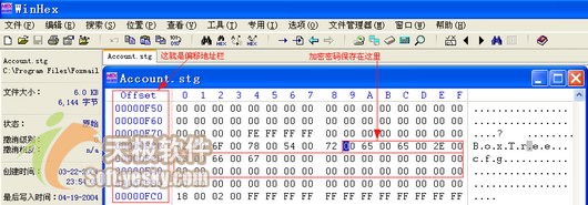 Foxmail的賬戶(hù)口令保存在該賬戶(hù)對(duì)應(yīng)文件夾下的Account.stg文件中,用16進(jìn)制工具軟件WinHex或UltraEdit打開(kāi)它,看Offset那一列,那是文件的偏移地址,從00000F89到00000FAF中的數(shù)據(jù)就是經(jīng)過(guò)加密的賬戶(hù)口令,如圖所示(圖4),把它們都改為“00”(沒(méi)有引號(hào)),然后保存就可以清空賬戶(hù)口令,接下來(lái)就能隨意查看自己的郵件了。