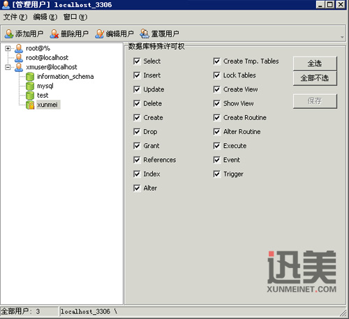 然后點(diǎn)擊剛才建立用戶左側(cè)的加號 ,展開就可以看到多個數(shù)據(jù)庫。點(diǎn)到剛才建立的數(shù)據(jù)庫xunmei再點(diǎn)擊右邊的“全選”,再點(diǎn)擊“保存”。這時xunmei數(shù)據(jù)庫上會有一個黃色鎖圖標(biāo),它表示xmuser用戶對xunmei數(shù)據(jù)庫有管理權(quán)限。如下圖: