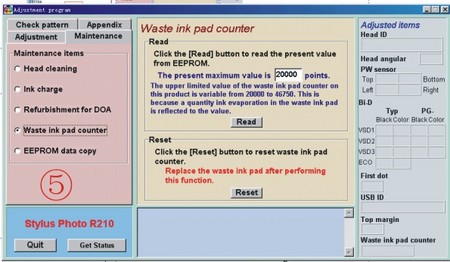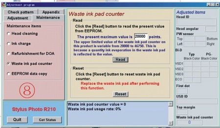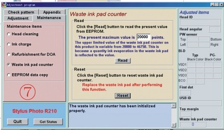 點(diǎn)擊“READ”下面藍(lán)色消息框中顯示廢墨倉(cāng)的當(dāng)前狀態(tài),看看數(shù)字是否超過(guò)20000。
