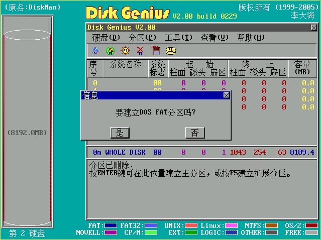 直接按回車兩次“確認(rèn)”,將所有的容量都分給新建的分區(qū)。確認(rèn)后出現(xiàn)“要建立DOSFAT分區(qū)嗎?”如下圖
