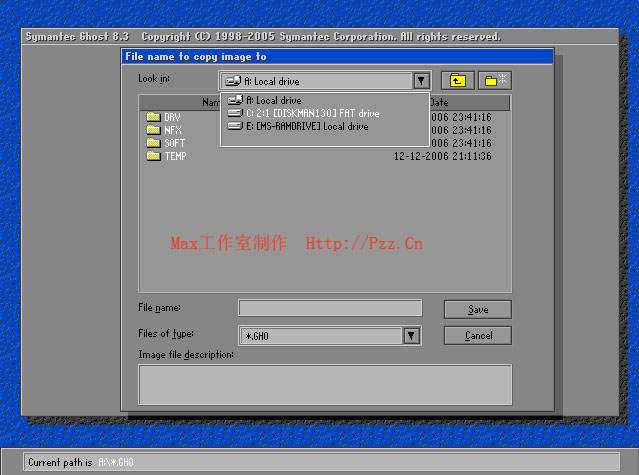 出現(xiàn)以上界面后,使用TAB鍵,切換至 “Look in”后面的框框上,注意會(huì)有亮框線出現(xiàn)。然后按光標(biāo)“↓”鍵,出現(xiàn)如上圖所顯示的,然后選擇 c:2:1 (這里的C代表在DOS下的盤符為C盤,而并非一定是WINDOWS下的C盤,后面的2:1代表的是第二硬盤的第一分區(qū),剛才我們已經(jīng)將整個(gè)硬盤分為一個(gè)分區(qū)了,所以這里只有一個(gè)分區(qū)) 后再按回車,輸入文件名如:max.gho 出現(xiàn)如下圖