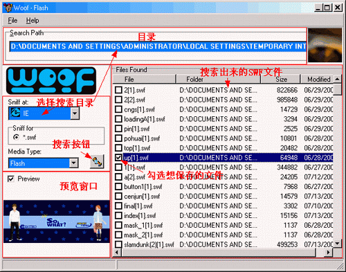 現(xiàn)在到了隆重推薦時刻,非??蓯鄣膚oof千里迢迢從家里(http://www8.pconline.com.cn/download/swdetail.phtml?id=5048)趕到了我的面前,嬉皮笑臉地對我說,讓它來露露臉。好吧,看在它那迷人的臉蛋上,我就向大家講講用它查找硬盤上的SWF文件。