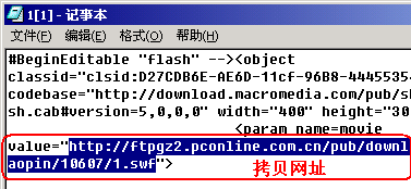 當(dāng)瀏覽網(wǎng)頁見到誘人的FLASH時,我的愛鼠右鍵就受苦了,一點(diǎn)擊它,在右鍵菜單中選擇“View source”(英文版本的IE)或者“查看源文件”(中文版本的IE),記事本就帶著密密麻麻的源代碼顯示在面前.