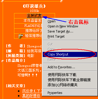 有很多網(wǎng)站為了方便網(wǎng)友看FLASH作品,常常提供了全屏欣賞,這種方式最受筆者的歡迎了,只要直接在鏈接上按鼠標(biāo)的右鍵,選擇“復(fù)制快捷方式(copy url)”,然后到下載工具上粘貼地址鏈接URL(如上法),這個FLASH作品又乖乖地歸到硬盤上去了。