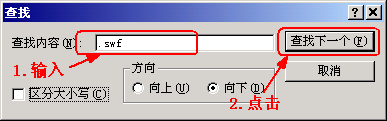 按下快捷鍵“Ctrl + F”,在彈出的對話框中輸入“.swf”,確定即可查找到FLASH的SWF文件,COPY下鏈接地址,注意看是絕對鏈接還是相對鏈接。
