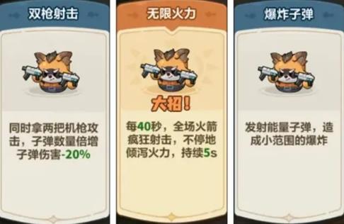 4、等級技能隨等級提升逐步解鎖,5級獲得大招選項(xiàng),10級解鎖浣熊軍團(tuán),15級提升導(dǎo)彈暴擊率20%,20級上陣合成時(shí)攻速大幅提升5秒,25級子彈數(shù)量增加1,30級傷害提升10%。