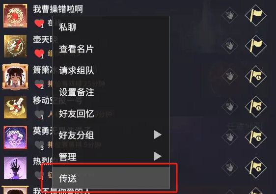 1、玩家打開好友列表找到想一起的好友,右鍵點擊該好友選擇傳送功能,便能快速到達(dá)好友所在的廳,輕松實現(xiàn)與好友在青鳥擂臺同處一地的目的。