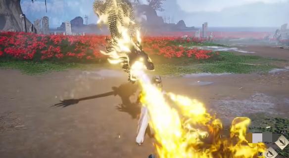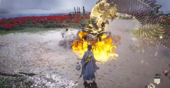 2、大世界正面使用時角色左側出現(xiàn)亮眼金龍,金龍口中噴射明黃色火焰,光芒耀眼照亮周圍區(qū)域,與背面的暗金風格形成鮮明對比,凸顯出明亮華麗的視覺特點。