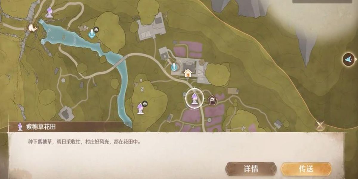 1、首先在游戲中打開地圖界面,在地圖眾多區(qū)域標(biāo)識中找到紫穗草花田的圖標(biāo),點(diǎn)擊紫穗草花田對應(yīng)的圖標(biāo),點(diǎn)擊傳送按鈕,角色便會(huì)自動(dòng)傳送到紫穗草花田。
