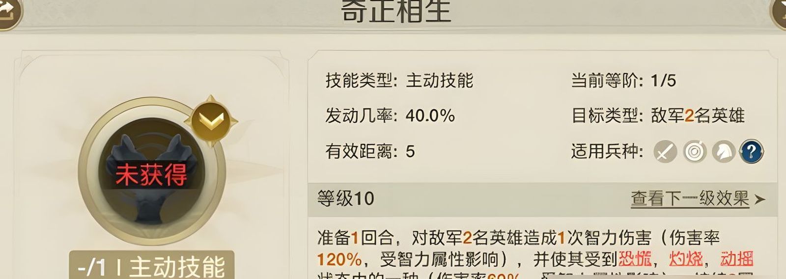 1、主動(dòng)技能奇正相生,對(duì)敵方兩名目標(biāo)發(fā)動(dòng)智力攻擊,有概率附加灼燒或動(dòng)搖狀態(tài)持續(xù)3回合,若目標(biāo)已處兩種狀態(tài)之一,60%概率造成雙倍傷害并附加另一種狀態(tài)。