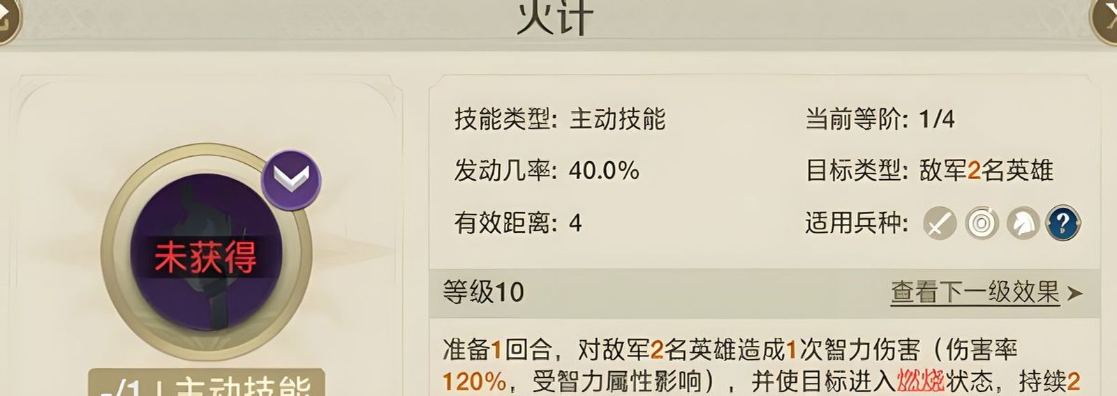 3、招牌技能火計(jì),對(duì)敵軍兩名英雄造成一次智力傷害,附加灼燒狀態(tài)持續(xù)2回合,若目標(biāo)已處灼燒狀態(tài)則效果翻倍,40%的觸發(fā)概率在實(shí)戰(zhàn)中相當(dāng)可靠,助力持續(xù)輸出。