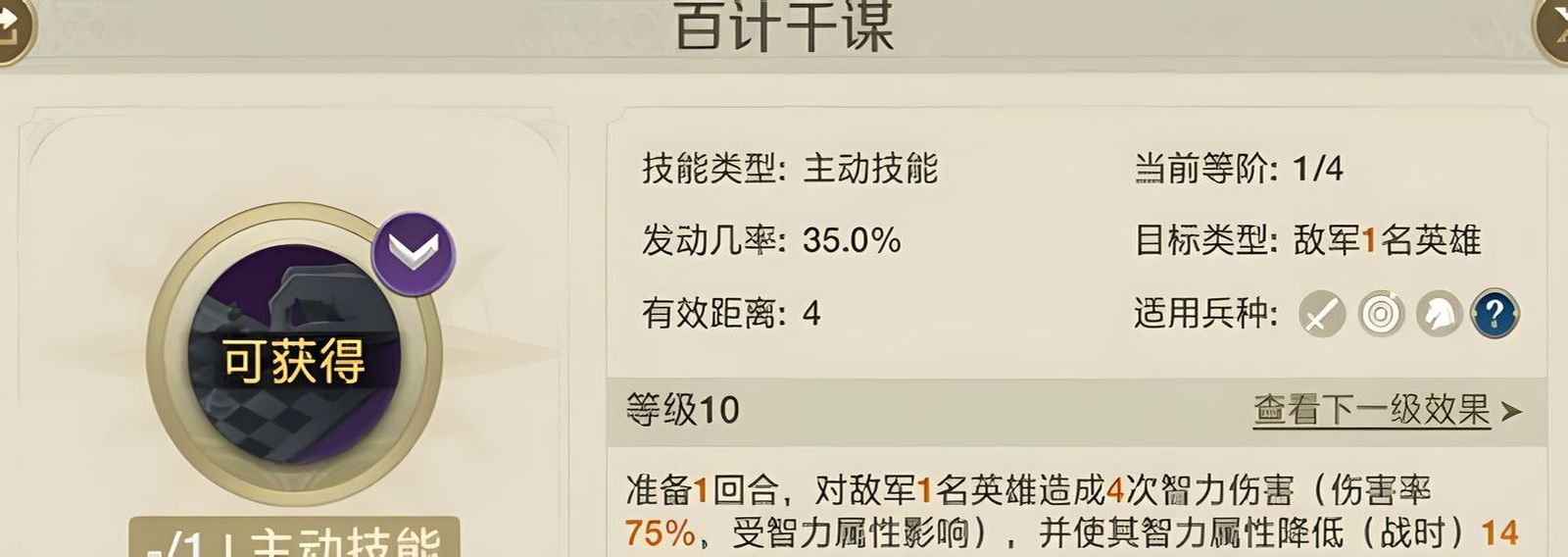 2、百計(jì)千謀需準(zhǔn)備1回合,對(duì)敵軍1名英雄發(fā)動(dòng)4次智力傷害且傷害率可觀,明智光秀使用時(shí)能借該技能打出連續(xù)輸出,同時(shí)可配合自身其他技能增強(qiáng)戰(zhàn)力,為戰(zhàn)局帶來(lái)有利影響。